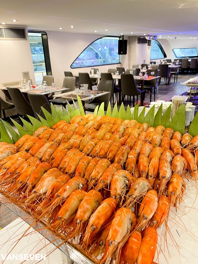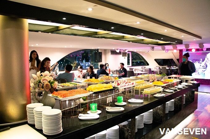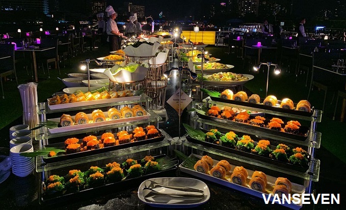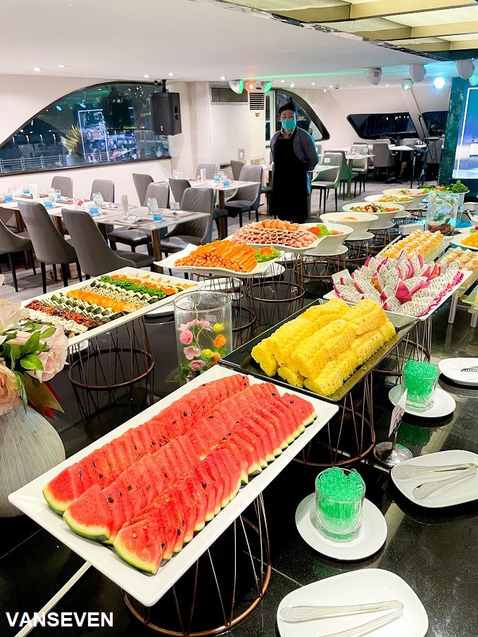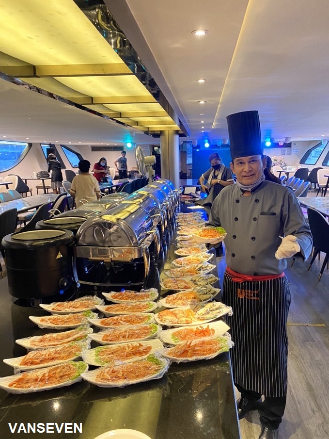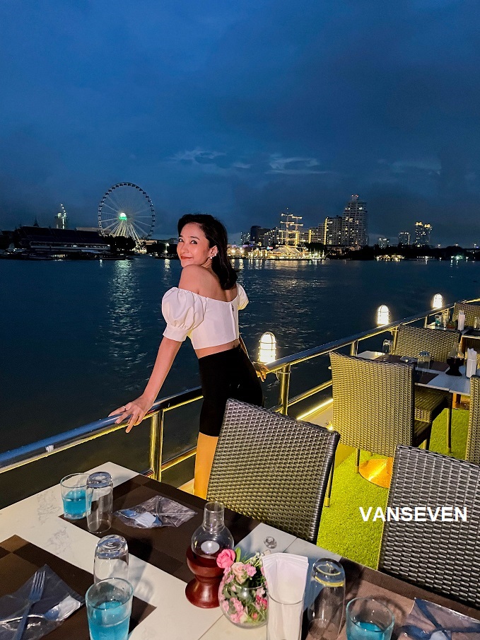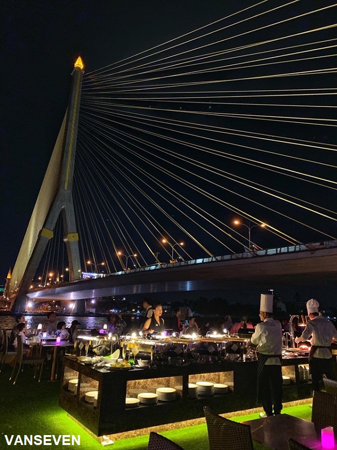 17.15 น. เรือออกจากท่าไอคอนสยาม เชิญท่านอิ่มอร่อยกับอาหารแบบบุฟเฟต์นานาชาติรสเลิศโดยเชฟฝีมือเยี่ยม เคล้าคลอด้วยเสียงเพลงอันไพเราะ จากวงดนตรีบรรเลงขับกล่อมระหว่างรับประทานอาหาร
