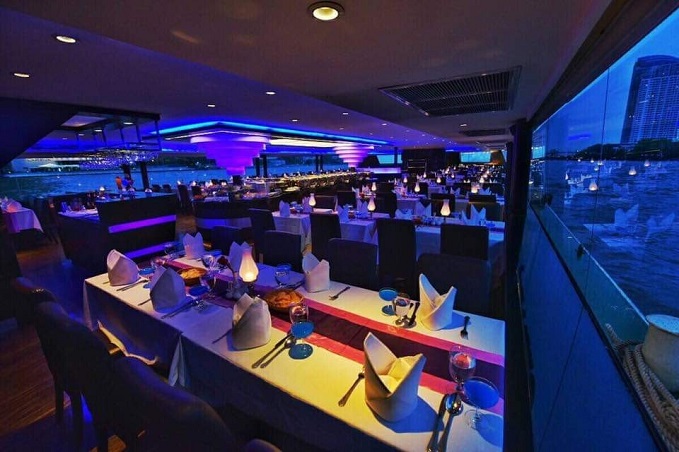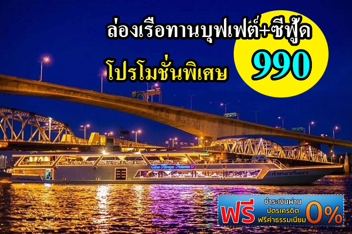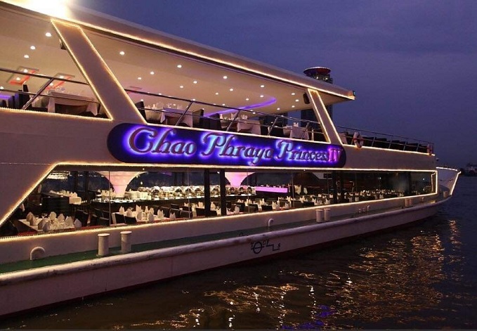 20.00 น. เวลาสำหรับความอร่อยกับอาหารบุฟเฟ่ต์นานาชาติเลิศรส ภายใต้ความโรแมนติคของแสงเทียนและเสียงเพลงสากลที่ท่านชื่นชอบ ตื่นตาตื่นใจกับความสวยงามของสถาปัตยกรรมสองฝั่งแม่น้ำเจ้าพระยา ในมุมมองที่ท่านอาจมิได้สัมผัสบ่อยนัก อาทิเช่น วัดกัลยาณมิตร วัดอรุณราชวราราม วัดพระแก้ว สะพานพระราม 8 พระราชวังบางขุนพรหม และสถานที่สวยงามต่างๆ อีกมากมาย ที่จะสร้างความประทับใจมิรู้ลืม
