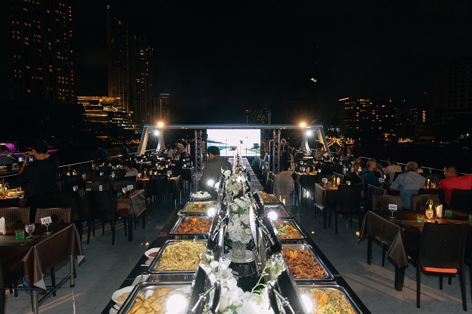 19.15 น. เรือออกจากท่าไอคอนสยาม เชิญท่านอิ่มอร่อยกับอาหารแบบบุฟเฟต์นานาชาติรสเลิศโดยเชฟฝีมือเยี่ยม เคล้าคลอด้วยเสียงเพลงอันไพเราะ จากวงดนตรีบรรเลงขับกล่อมระหว่างรับประทานอาหาร และสนุกสนานเพลิดเพลินกับการแสดง อาทิเช่น นาฏศิลป์รำไทยและการแสดงต่างๆ ที่เตรียมไว้สำหรับท่านโดยเฉพาะ และบริการท่านด้วยระบบแสงสีเสียงที่ดีที่สุดในลำน้ำเจ้าพระยา เส้นทางล่องเรือผ่านสถานที่สำคัญที่น่าสนใจ ดังนี้ “ไอคอนสยาม – สะพานพุทธ – วัดอรุณราชวราราม – พระบรมมหาราชวัง (วัดพระแก้ว) – สะพานพระปิ่นเกล้า – สะพานพระรามแปด – เรือกลับลำ – สะพานตากสิน – เอเชียทีค เดอะริเวอร์ฟร้อนท์ – วนกลับท่าเรือไอคอนสยาม”