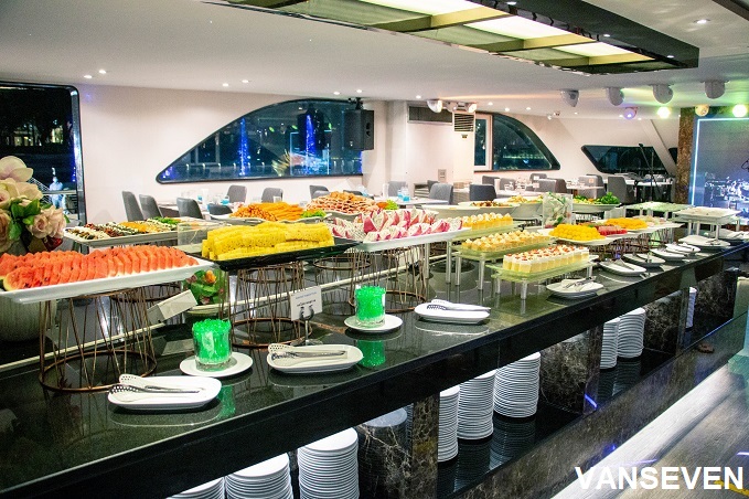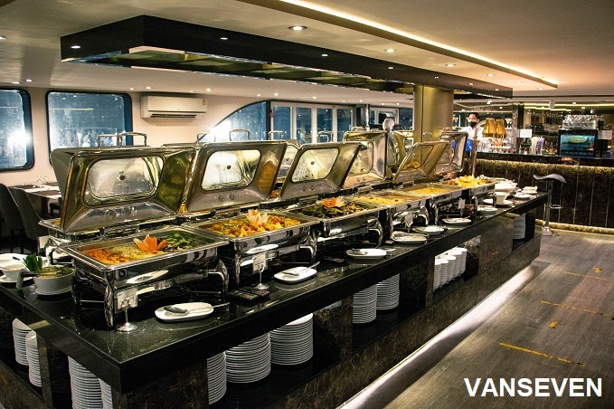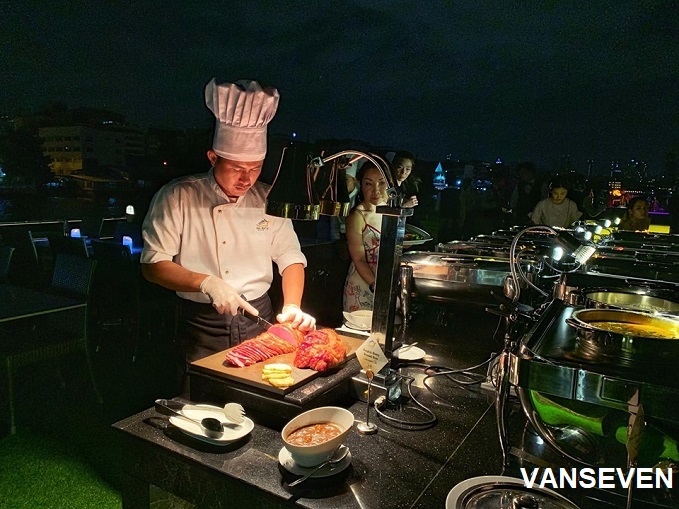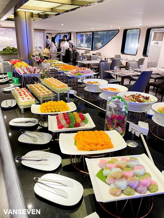 17.15 น. เรือออกจากท่าไอคอนสยาม เชิญท่านอิ่มอร่อยกับอาหารแบบบุฟเฟต์นานาชาติรสเลิศโดยเชฟฝีมือเยี่ยม เคล้าคลอด้วยเสียงเพลงอันไพเราะ จากวงดนตรีบรรเลงขับกล่อมระหว่างรับประทานอาหาร
